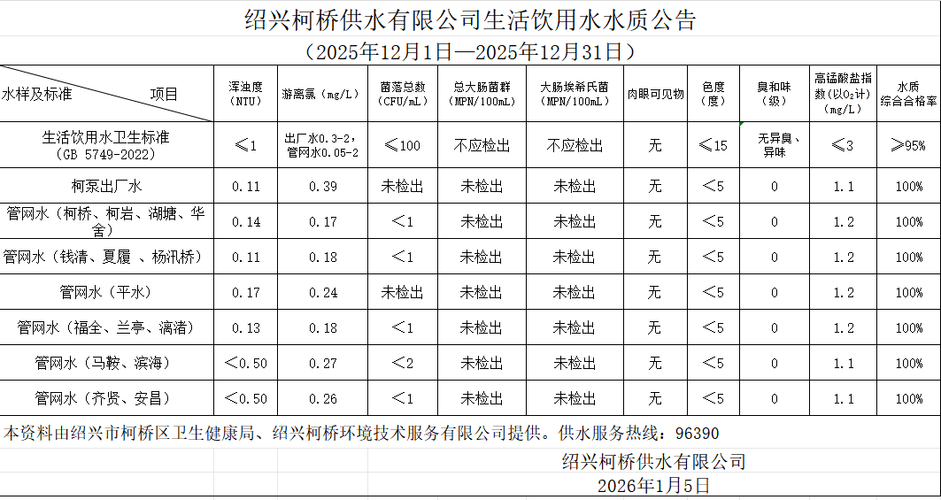 生活飲用水水質(zhì)公告(2025年12月1日—2025年12月31日)