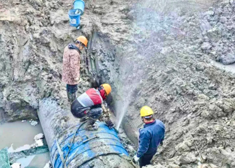 經(jīng)現(xiàn)場(chǎng)緊急排查,確定為一根直徑20厘米的供水管道發(fā)生破裂。搶修人員不顧嚴(yán)寒,迅速制定方案、調(diào)度設(shè)備。戶(hù)外溫度逼近冰點(diǎn),作業(yè)坑內(nèi)積水寒冷刺骨,搶修人員卻毫不猶豫跳入坑中,在泥水交加的狹小空間里展開(kāi)搶修。經(jīng)過(guò)連續(xù)幾個(gè)小時(shí)的緊張作業(yè),破裂管道于下午2:00被成功修復(fù),供水恢復(fù)通暢。