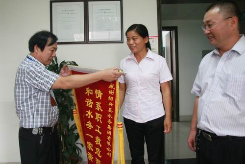 8月17日,家庭遭受火災(zāi)的供水公司分公司職工莫煜君在分公司負(fù)責(zé)人及村支書的陪同下來(lái)到集團(tuán)公司送上一面“情系職工救危困,和諧水務(wù)一家親”錦旗,感謝集團(tuán)工會(huì)對(duì)其的幫助。