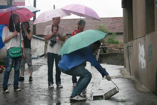 來到一個弄堂口,小吳說,你們不用跟我進來,里面只有一只表,等會還要原來返回。不一會,他回來了。因為弄堂又長又窄,小吳只好撐下傘鉆出來。