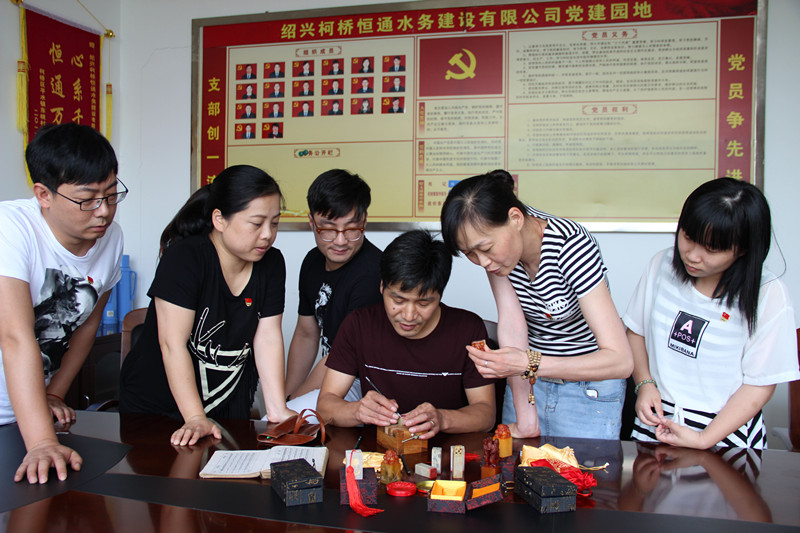 為進一步推進“兩學一做”學習教育,日前,恒通水務(wù)建設(shè)公司黨支部組織黨員以“黨在人民心中”為主題進行書法、篆刻創(chuàng)作,廣泛地吸引了黨員干部參與。圖為公司職工金偉勇在向黨員們傳授篆刻的竅門。