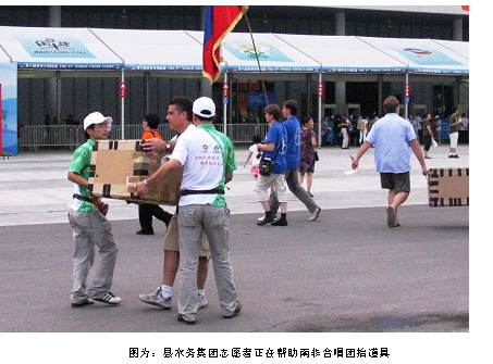 檢票口通道處突然出現(xiàn)個頭頂大箱的外國人,看他很吃力的樣子,隊員主動向前提供幫助,經過一番的交流,得知該團隊是來自南非的合唱團,搬大箱子的是該團的指揮,里面裝著的是南非民族樂器打鼓,是今天晚上表演的道具,隊員們將沉甸甸的大箱打鼓搬運到了舞臺幕后。