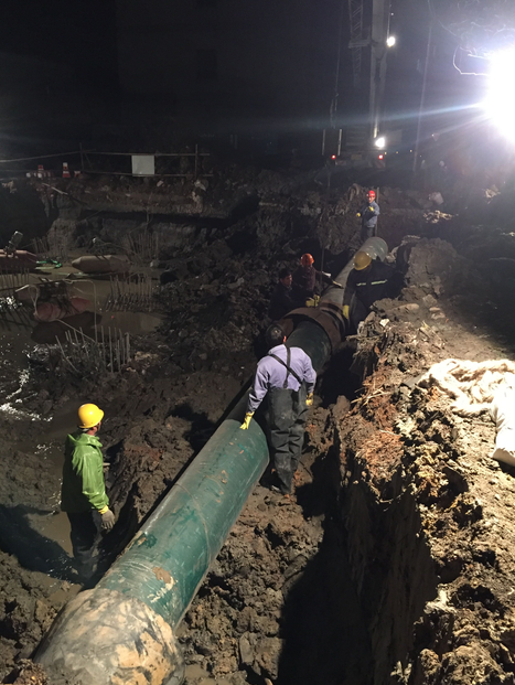 柯北分公司接到險情報告后,第一時間啟動大口徑搶修應急預案,一是立即關閉沿線總閥,對低層用戶實行備用回路供水,把停水面積減少到4000戶,并立即派人現場張貼停水通知;二是管網科立即組織骨干搶修人員,制定管線搶修實施方案,因破損的管線為水泥砼管,且破裂處較多,維修難度較大,最終確定用DN600鋼管替換。