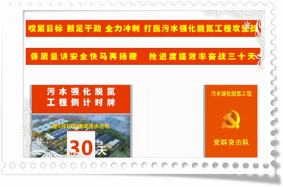 目前,在污水強(qiáng)化脫氮工程現(xiàn)場(chǎng)明顯位置,已樹立工程沖刺倒計(jì)時(shí)牌。公司要求,各級(jí)領(lǐng)導(dǎo)干部人員必須清醒認(rèn)識(shí)到形勢(shì)嚴(yán)峻,要在最后1個(gè)月的時(shí)間里拿出更大的干勁全面沖刺,確保工程建設(shè)任務(wù)的按期完成。同時(shí),公司黨支部錢書記也特別強(qiáng)調(diào),要充分發(fā)揚(yáng)黨員干部先鋒模范帶頭作用,使廣大黨員平常時(shí)候看得出來、關(guān)鍵時(shí)刻站得出來、危急關(guān)頭豁得出去,要將把黨的政治優(yōu)勢(shì)轉(zhuǎn)化為項(xiàng)目推進(jìn)優(yōu)勢(shì),把黨建力量凝聚為奮斗合力,確保工程順利建成通水。